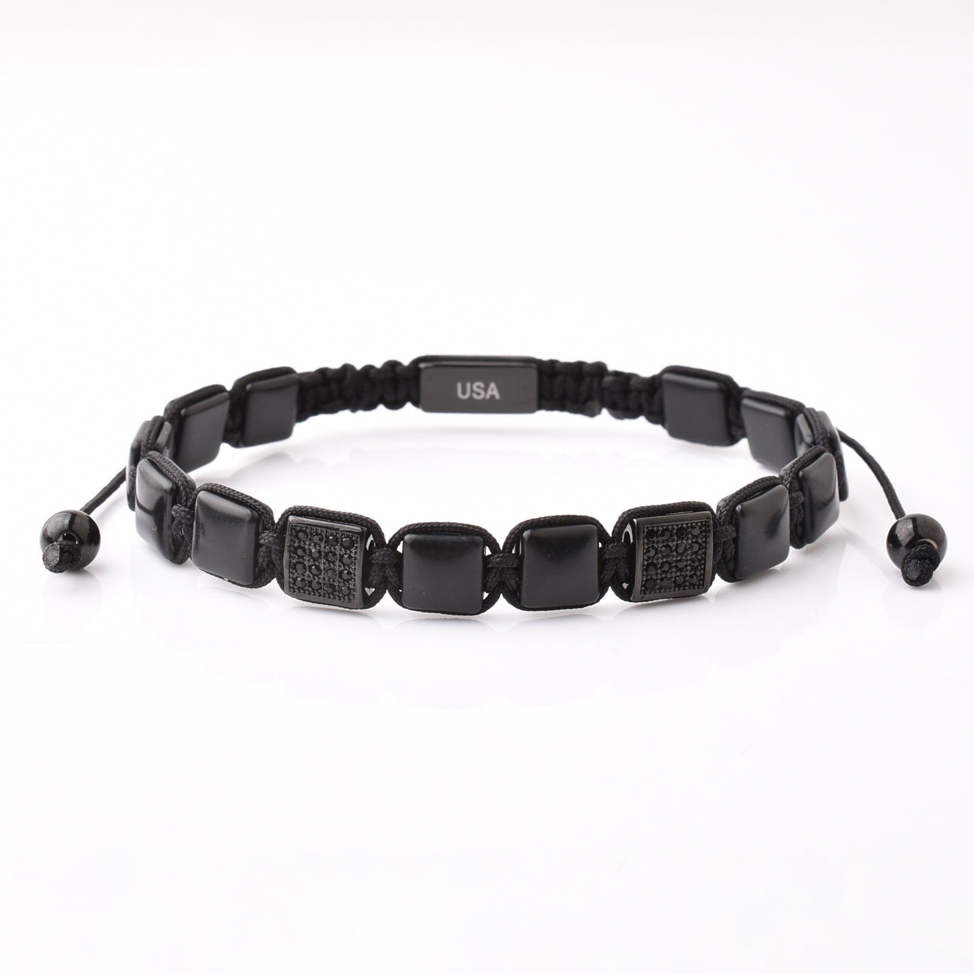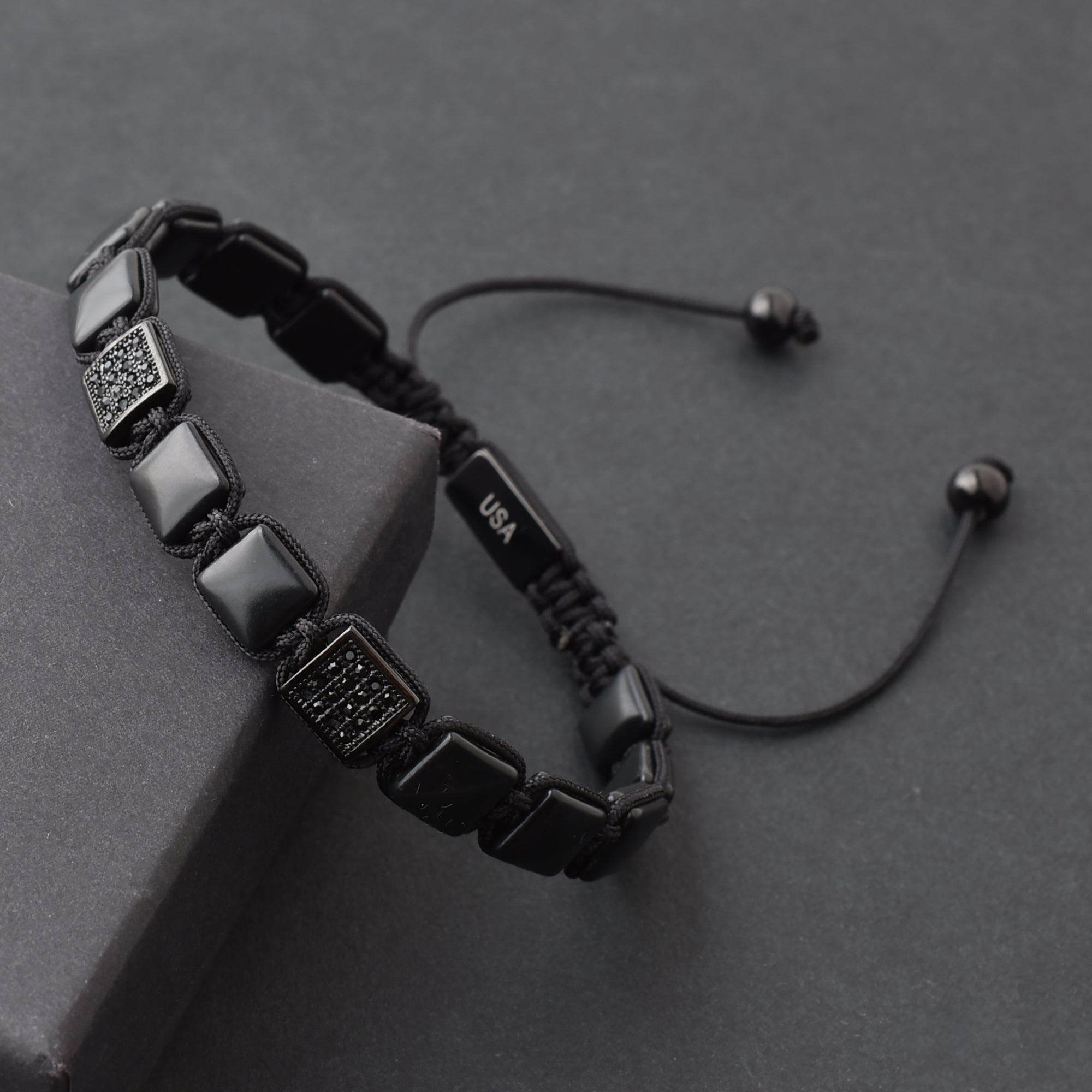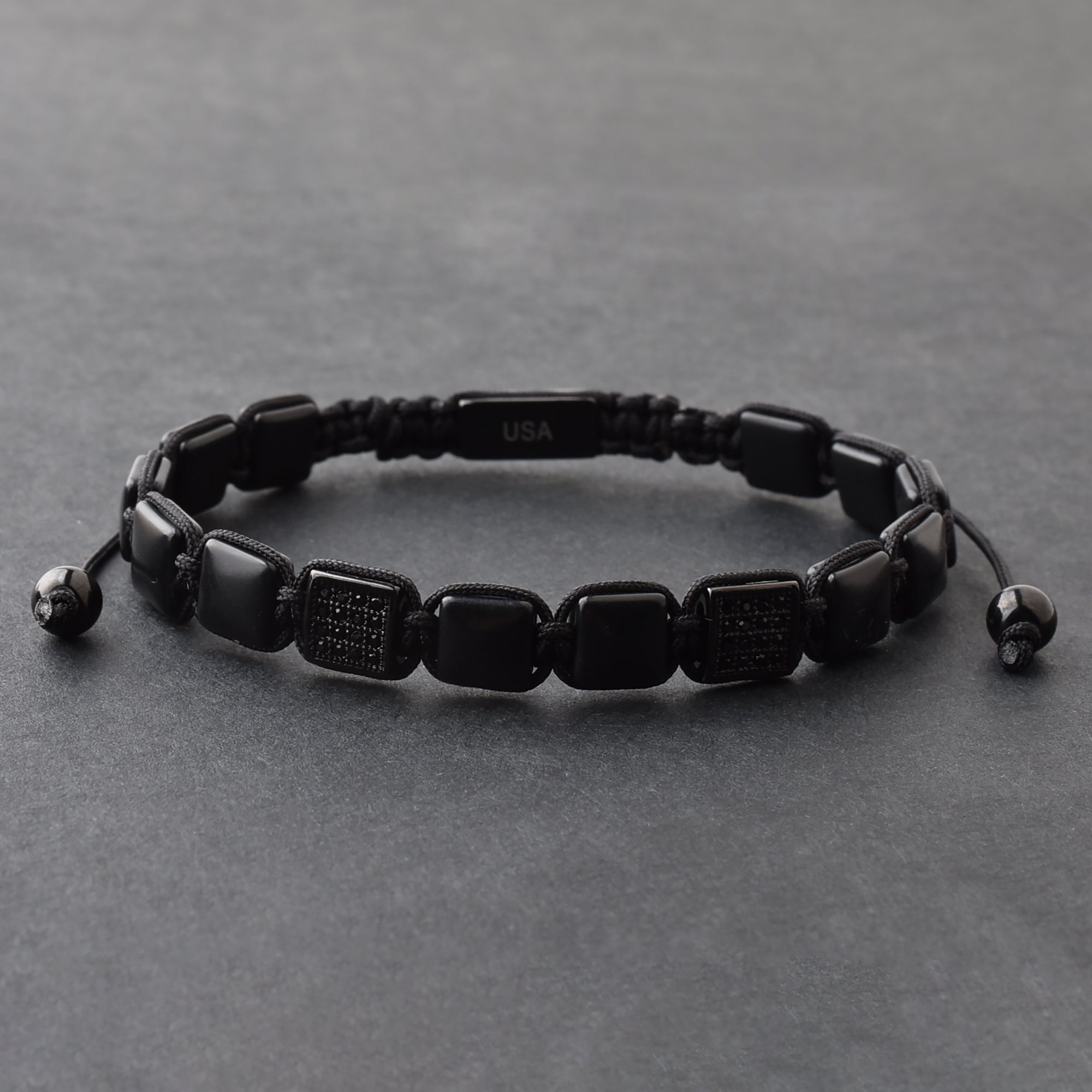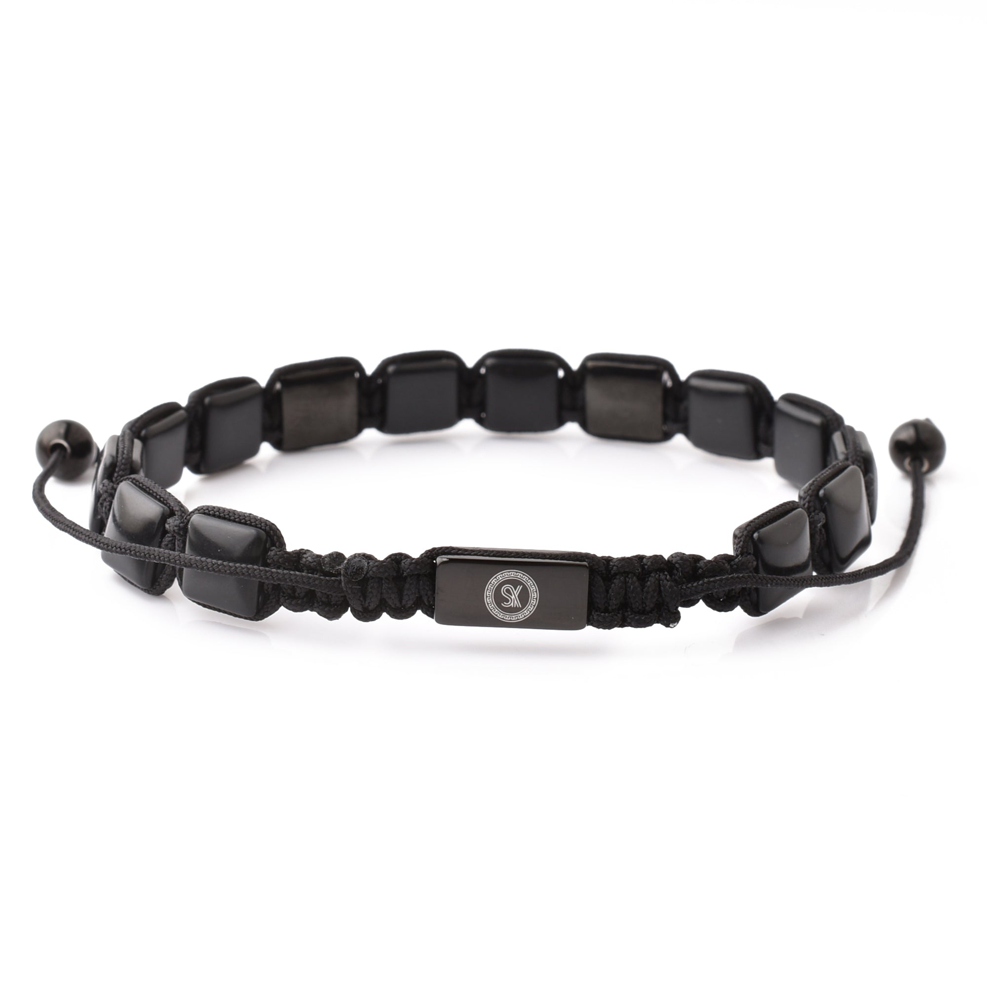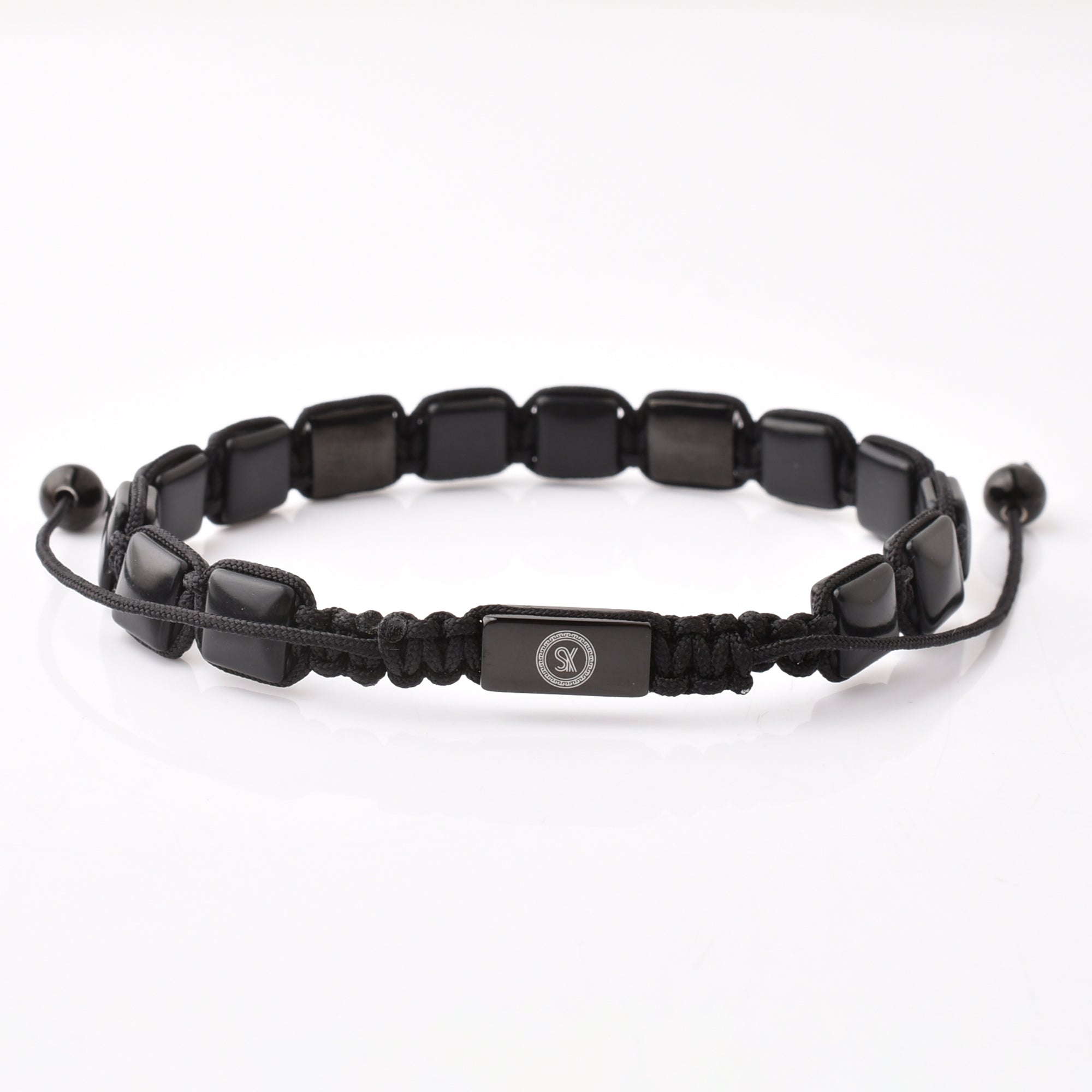 Black Flat Gemstone Beads Bracelet, Adjustable Knot - 8mm